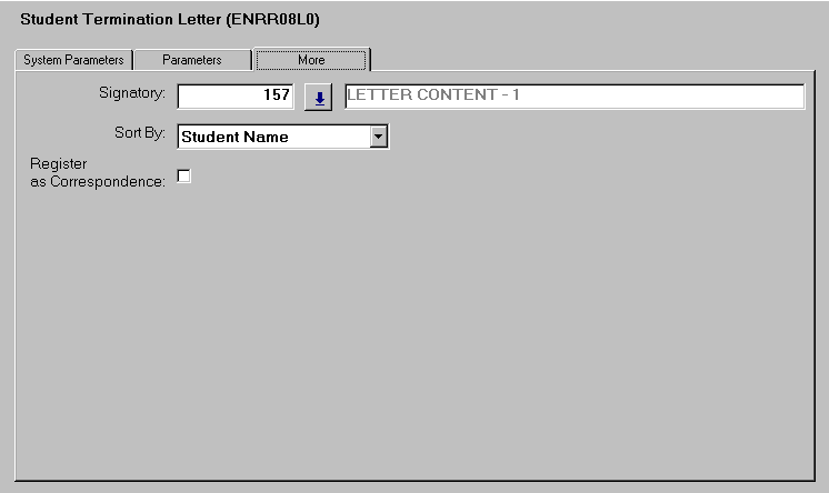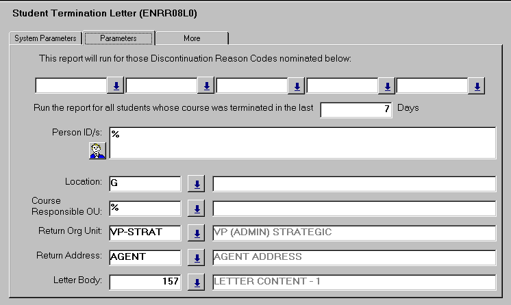 Most parameters for this job are used to refine the data set produced in the report. Select Discontinuation Reason codes for terminated student course attempts. Other discontinuation reasons are reported in the Course Discontinuation/Intermission Letters report ( ENRR08K0).Record the number of days included from the current day. For example: entering 7 includes all student course attempt records intermitted, discontinued or lapsed in the last week. Optionally create a letter for a specific person ID. This is mostly used where a student's course attempt status was updated manually. The Return Organisational Unit and Return Address provide information to the student on where they can seek further details. Note: the return address MUST be valid for the organisational unit. There are two text fields available: