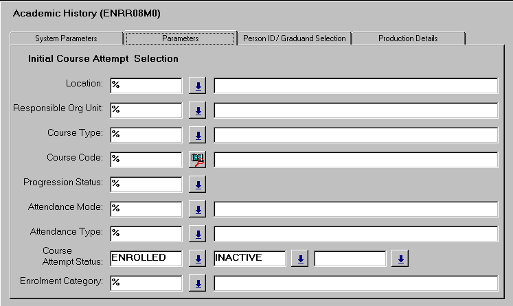 optional - narrows the selection to student course attempts of students with graduand records for the specified ceremony round. This parameter could be used where academic histories are produced to assess eligibility to graduate. The first course attempt status parameter would normally be set to %. Where this parameter is used, one or two Graduand Status parameters must be entered. |