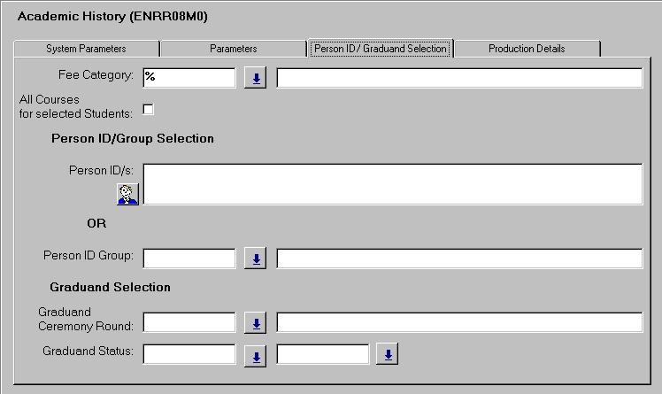 Person ID/Group Selection - may be used in conjunction with, or instead of, Initial Course Attempt Selection parameters. Should not be used in conjunction with Graduand Selection parameters. |