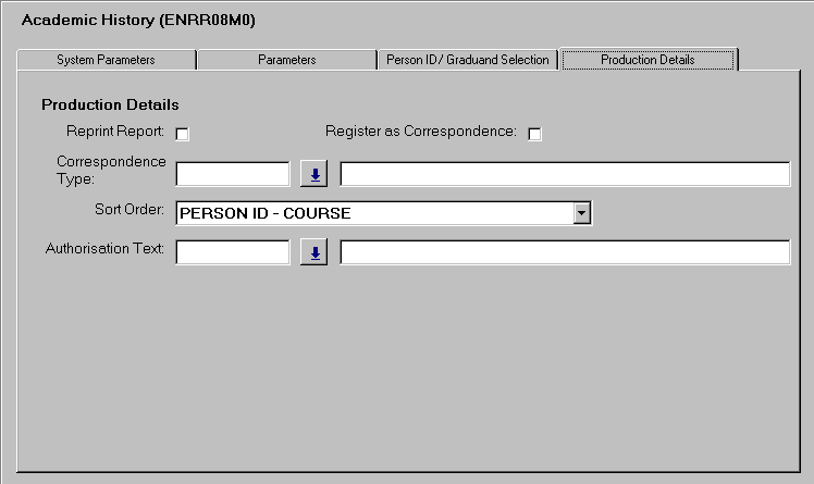 The Academic History report can create a correspondence record for each student for whom records are produced. This facility can be used when deemed appropriate, either to record that an academic history has been sent to a student, or to record that an academic history has been produced for a particular administrative purpose. Correspondence records are only created where the Register as Correspondence parameter is set to Y. Appropriate correspondence types must be established for use by this report (in CORF2110) and must be attached to the correspondence categories which use them (in CORF2200). The correspondence types must also be associated with this report (in CORF2110). Only student course attempts with a correspondence category linked to the appropriate correspondence type will have a correspondence record created for them. |