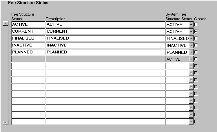 Use this form to assign status names chosen by the institution to system fee structure statuses. One or more institution defined statuses can map to each system status. Statuses no longer required can be closed. Once assigned to a level, a status cannot be deleted. |