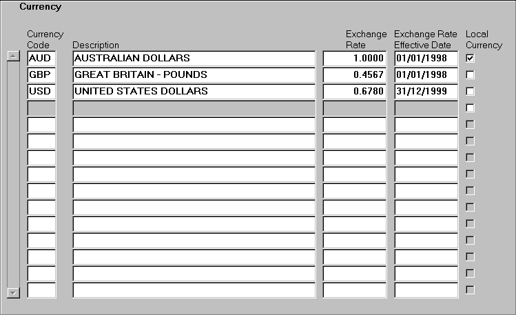 Notes: Only one currency can be set as the local currency. No historical data on exchange rates can be kept using this form. The exchange rate current at the time of assessment or reassessment is recorded in the transaction record. It is recommended that current exchange rates are recorded in this form before assessments for the relevant categories are made. |
