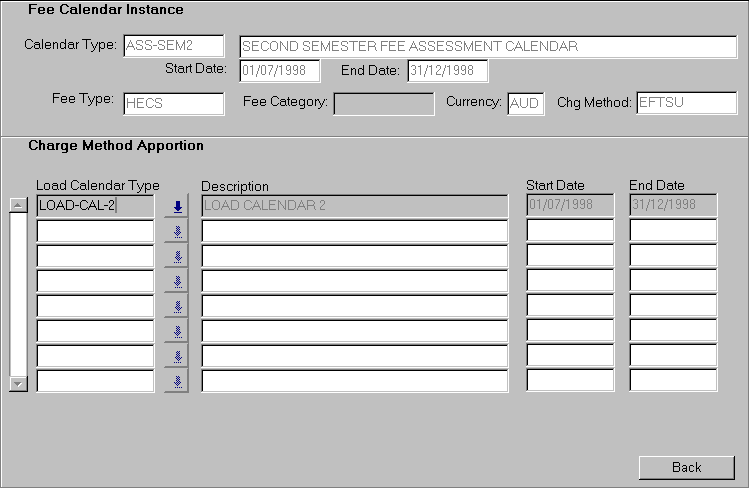 For each fee, use this form to record the load calendar instance that is related to the fee calendar instance shown in the context block. Deletion of load calendar records is possible. However, it is strongly advised not to make changes once fee assessment has started for a fee period. |
