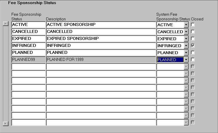 Use this form to assign sponsorship status names chosen by the institution to system sponsorship statuses. One or more institution defined statuses can map to each system status. Statuses no longer required can be closed. Once recorded against a sponsorship record, a status cannot be deleted. |