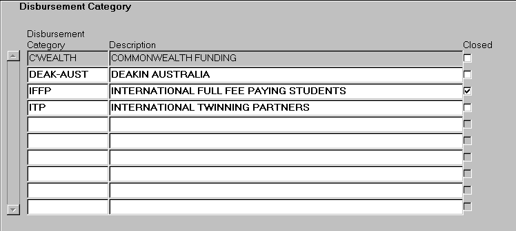 Disbursement categories are defined by an institution. Their use is optional. Where required, they are recorded and maintained using this form. |