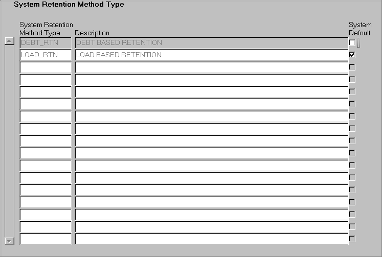 Use this form to select one of the two system values DEBT_RTN or LOAD_RTN. This will determine which retention method is to serve as the default when using FINF28A0. |