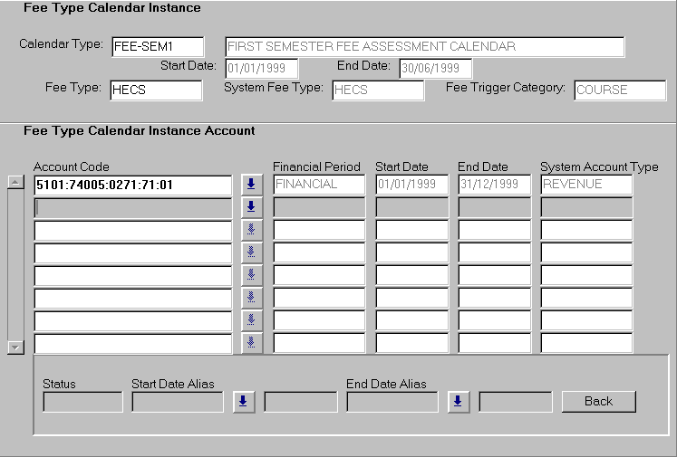 The Fee Calendar Instance block identifies the selected fee type and fee period to which the revenue and tax account codes apply. |