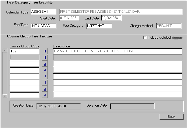 Use this form to record, maintain or view the course groups liable for the fee shown in the context block. The code of the course group entered here as a required field indicates those course versions which are to be matched to the course attempts of eligible students by the fee assessment routine, in order to levy the selected fee. Course groups are set up in CRSF11D0. It is not possible to distinguish between different course offerings using this form. To logically delete triggers, select and delete the record as normal. No Save is necessary - confirmation is requested before an automatic logical deletion is performed. A deletion date is supplied by the system.