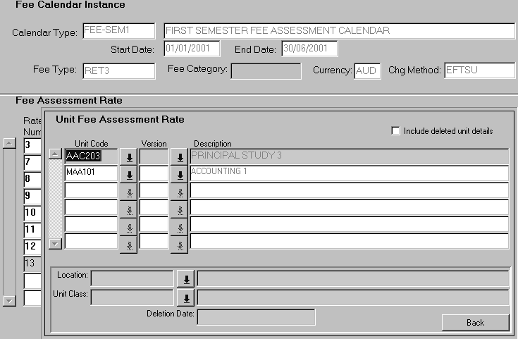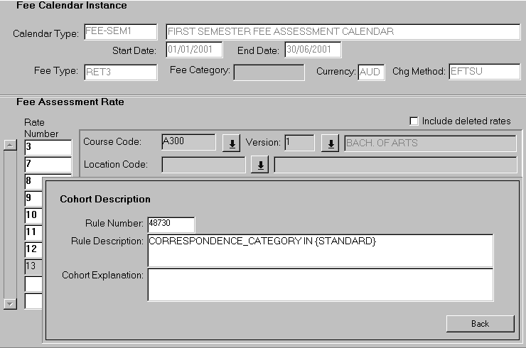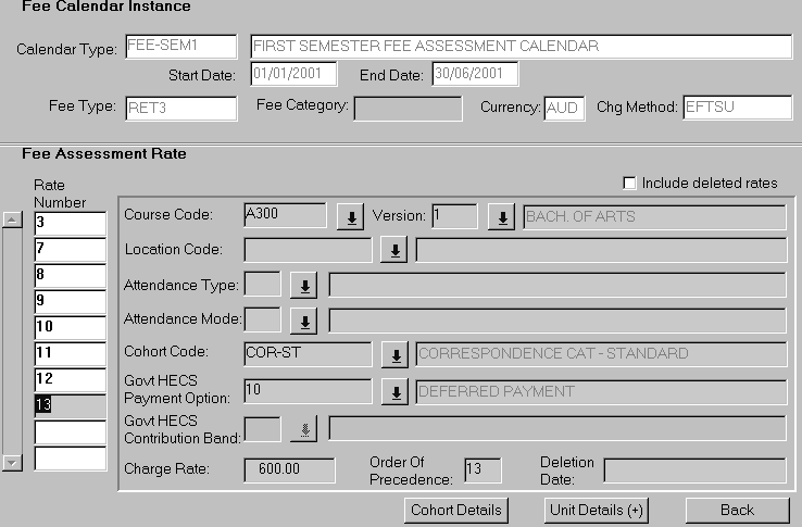 level, but only to display the existing data. Multiple rates. Within a level, multiple charge rates can be set up for a single fee depending on various course attempt attributes (course, course version, location, attendance type, attendance mode), unit attempt attributes (unit, unit version, unit location, class), cohort,or government payment classifications. For instance, the rate of a general service fee may depend on the location at which a student is studying, while HECS rates applying after the introduction of differential HECS vary according to government contribution bands. Care needs to be taken when setting up these attributes and payment characteristics that the circumstances of all students due to pay the fee are covered by one or other of the permutations. This is documented in more detail in the Rates section of Special Topics. |
