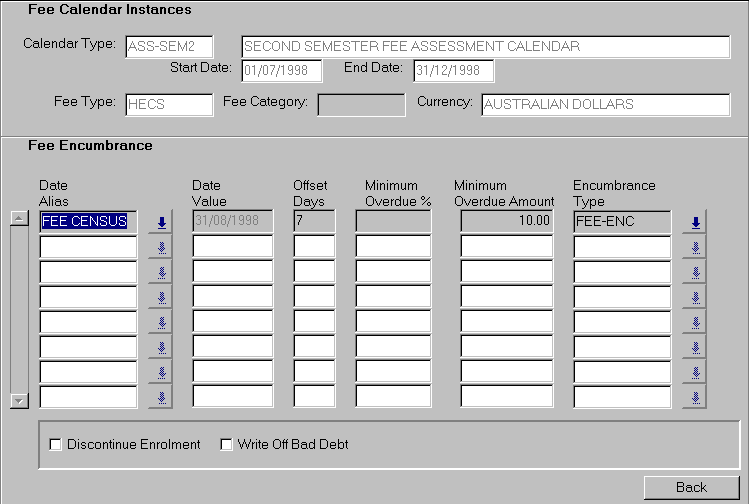 In both these cases, fees without schedules at either FTCI or FCFL level will have encumbrances applied according to the category schedule at FCCI level, even if they are in a group with other fees where an override applies. However, note the important exception described under WARNING for HECS and institution fees. Where a fee is not covered by a schedule at any level, encumbrance effects do not apply. HECS and institution fees. For fees with a system fee type of HECS or a system fee trigger category of INSTITUTN, encumbrance schedules must be at FTCI level. WARNING. For these two cases, the fee assessment routine takes no account of schedules at any other level. Lack of a schedule at the FTCI level is taken to mean that no schedule exists, and therefore that no encumbrance applies. This is so even where a category which includes the corresponding fees as liabilities has a schedule attached. Level access. The form is accessed