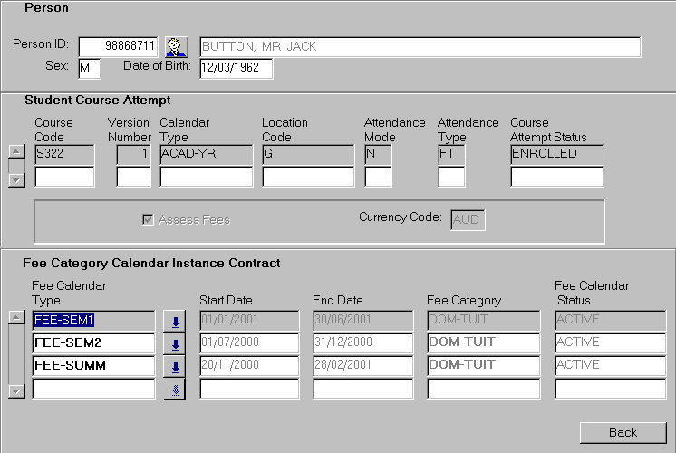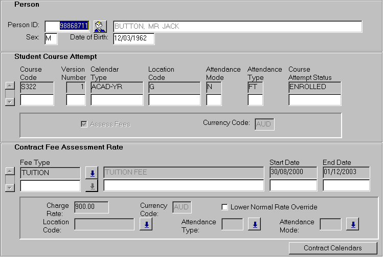 To create and maintain a contract charge rate for one or more fees in an individual student's designated course attempt and associate contract charge rates with fee assessment periods. |