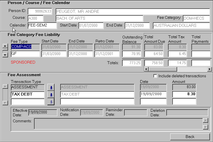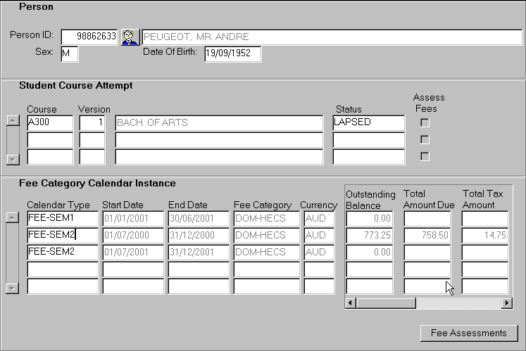 To see more detailed fee information for the course attempt in the fee period selected, navigate to a second screen via the Fee Assessments button. |
