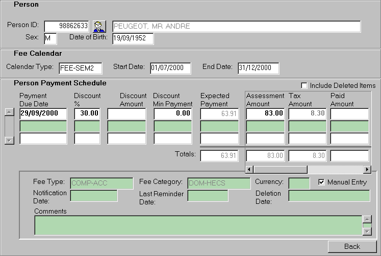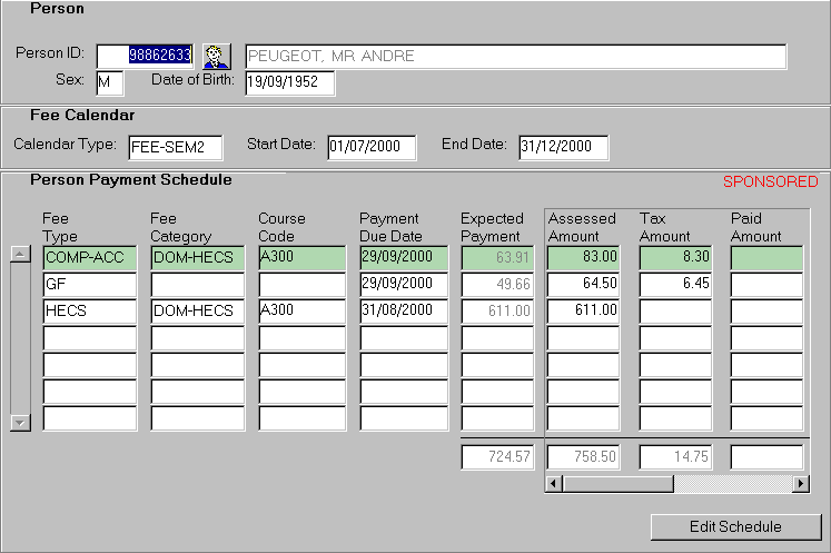 This form allows inquiry on a student's payment history in a particular fee period. It gives details of outstanding debt and amounts already paid for each fee for which the student is liable, with a separate entry for each date on which payment of a fee is required – the facility exists for any fee except HECS to be paid in instalments. The information shown here is known as the 'person payment schedule' and forms the basis of a Statement of Account sent to a student, a Reminder Notice sent to a student, and a Sponsor Summary Statement sent to a sponsor. Statement of Account extract records are created by running FINJ6120, Reminder Notice extract records are created by running FINJ6121, Sponsor Summary extract records by running FINJ6130. HECS fees will only ever have one entry in this form, and any increases or decreases to the debt will be reflected in that entry. Editing. For those with the necessary security privileges, the form can also be used to amend and add entries to adjust a student's payment schedule. Amounts can be redistributed over different dates. However, the total amounts involved cannot be changed except indirectly through an alteration of the allowable discount. The intention is to enable correction of an administrative error or, at the discretion of the institution, to allow a student to postpone payment or spread payment over more instalments. More stringent restrictions apply to amending HECS fees than to altering other system fee types. Related forms & processes. The 'person payment schedule' records displayed here are created and maintained by the Process Person Payment Schedules job, FINJ6111. This job supplies the current form with the following new or updated information for each fee: