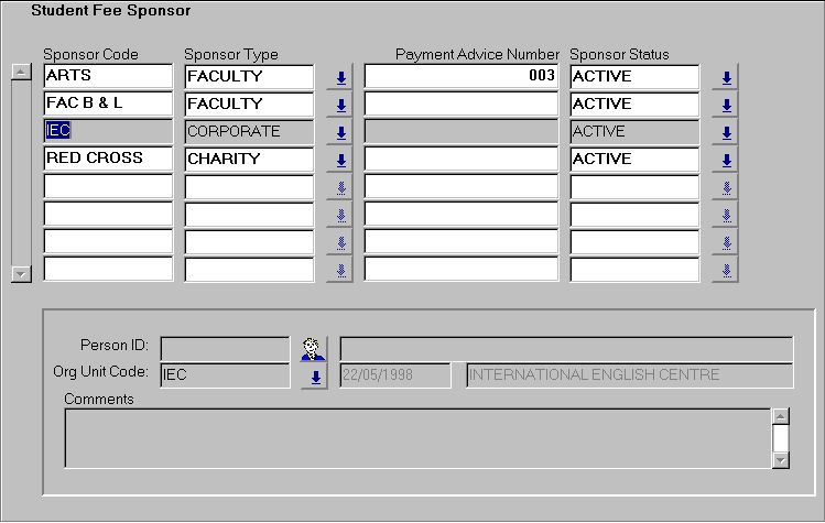 Use this form to register individuals or organisations already held on the database as sponsors in the Student Finance subsystem.