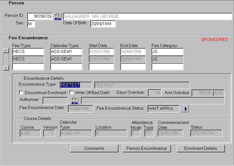 Note: Authoriser details must be entered when a fee encumbrance is cancelled. Some encumbrances require that a student's enrolment be discontinued. A message advises this. Use the Enrolment Details navigation button for direct access to the enrolments form, ENRF3000, to perform the required actions. The Person Encumbrance button gives direct access in context to form ENRF6310 to maintain encumbrances. |