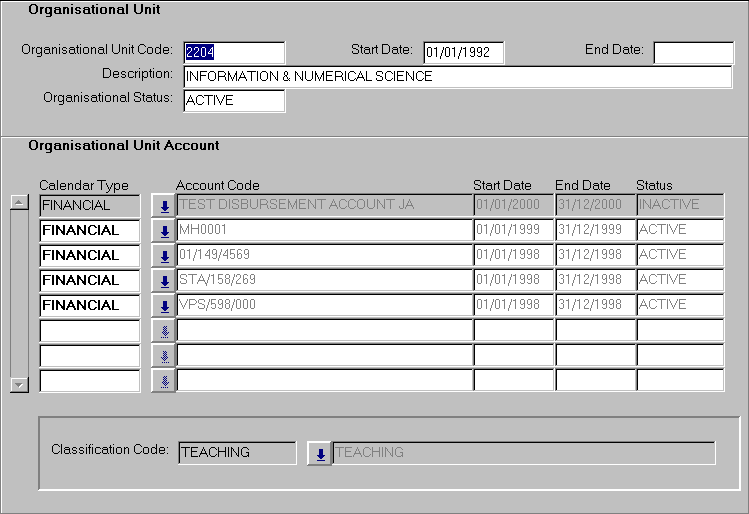 Disbursement accounts assigned to organisational units receive income from fees distributed across the various budget centres of an institution. Distribution is according to a set of formulas for each fee type, and the mechanism for this disbursement is via classifications recorded against formulas and accounts. An institution's organisational units are recorded and maintained in the form ORGF0141. The accounts to receive disbursed income are set up using the form Maintain Fee Posting Accounts, FINF1800 and classification codes are recorded in FINF1H00, Maintain Account Classifications. This is one of two forms that can be used to set up the links between organisational units, accounts and classification codes. The other form is Maintain Account Classifications (FINF1H00). The difference is in the grouping - data is entered and displayed by organisational unit in this form but by classification code in FINF1H00. Once recorded, the same data appears in both forms. The formulas used to assign income to organisational units by classification are recorded using form FINF7210, Maintain Fee Disbursement Formulae. |