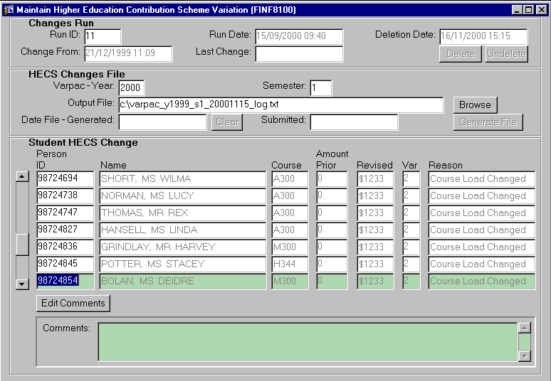 HECS Change The HECS change records for the context Changes Run are displayed. Where required, add comments to particular records by either typing directly into the Comments field, or using the editing tool invoked by the Edit Comments button. |