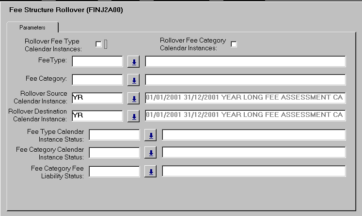 into FEE-SEM1 in 2000. The final three fields allow for the selection of the intended statuses of fee types, fee categories and fee liabilities in the destination fee period. A choice can be made to rollover this data into an institution defined equivalent of the system fee structure status ACTIVE or PLANNED. Using the default '% ALL' option will set the target status to whatever status was defined for the source data. |