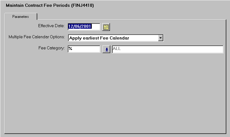 Effective DateEnter the date to be used to determine the selection of Fee Calendars. The date may or may not be the current date. This date must be within the start and end dates of the fee contract period. Multiple Fee Calendar OptionsThis option is used to detemine the course of action when multiple Fee Calendars are found that cover the end date of the contract. The available values are: