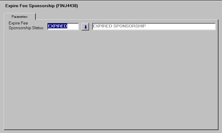 If an institution has more than one fee sponsorship status mapped to the system defined status of EXPIRED, it is necessary to chose the status required. If only one status has been mapped to EXPIRED, this is the parameter default. Statuses are established in the form Maintain Fee Sponsorship Statuses, FINF1B00. |