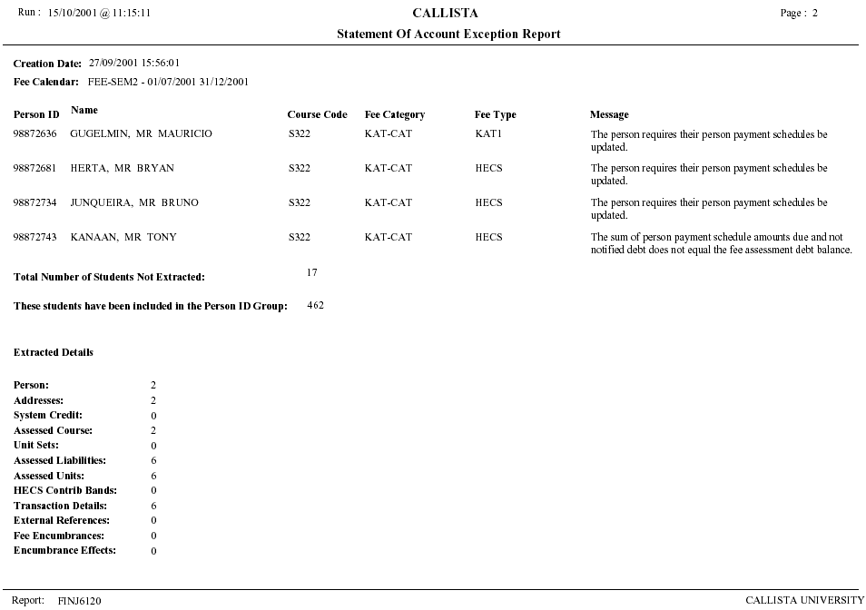 A range of data is extracted from Callista database tables. This data, plus some entered by parameter, is used to create Statements of Account for students liable for fees in a specific period and is written in the form of extract records to the generic S_EXTRACT_RECORD table. A single record is written to the S_EXTRACT table to identify a particular run instance of this job when it has completed successfully. The extract relates only to student debtors. A different statement (FINJ6130) is provided for sponsors undertaking payment of student's fees. The extract table methodology enables flexibility for the institution to produce customised statements of account. Extraction criteriaThe primary extraction criteria is that a debt exists within the financial period for a student satisfying the parameter selection criteria. Records are extracted even if the debt is fully paid. Extraction is always for a single financial period. Further selection can be made by supplying specific parameter values. A Statement of Account extract will be produced if a person payment schedule exists for the student with: