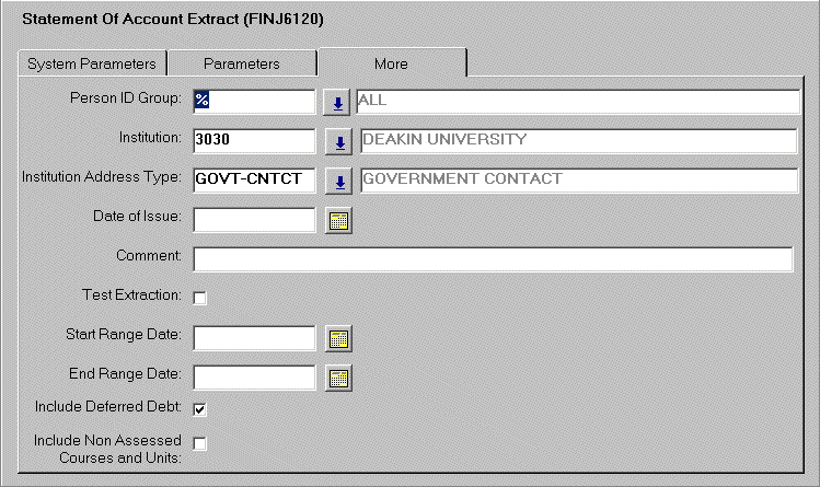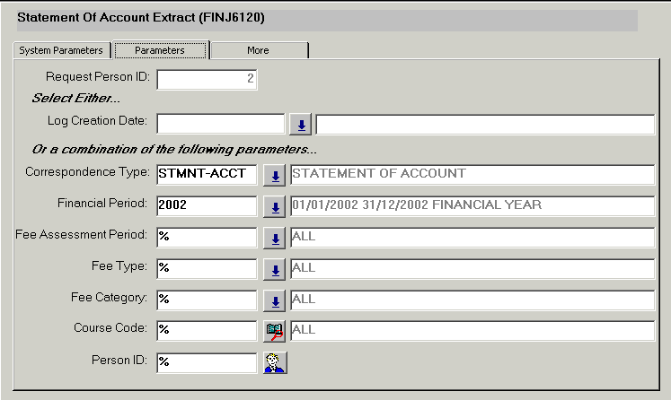 Required Parameters Select a value for correspondence type (see Extraction Criteria and Update Process) from the list of values (LOV) displaying the types mapped to this job. For reminder statements of account, a specific correspondence type should be selected. Select also an active financial period. Under the More tab, select an institution code and address type, used to retrieve the required institution address for printing on the Statement of Account. (Note that the LOV shows only closed address types. This is in line with the recommendation that once established, institution addresses should be closed to prevent their display in general LOVs.) Optional selection parametersTo further limit the students whose records are extracted and/or the debts for which a Statement of Account is to be issued, a specific value can be nominated for any or all of the following: