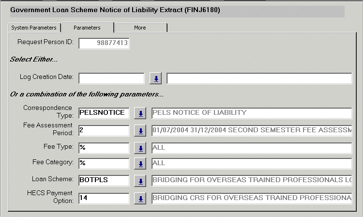 optional - a single HECS payment option can be selected. Allows this job to be run separately for each Government Loan Scheme option. Comparison is made to students' course attempt HECS options current at the census date associated with the fee period. The default is HECs payment options. A % will select all HECs payment options. The Loan Scheme that the job is run for will determine which of these views is populated, ie. Loan Scheme = PELS, and PELS_LBLTY_EXTRACT_V is populated. |