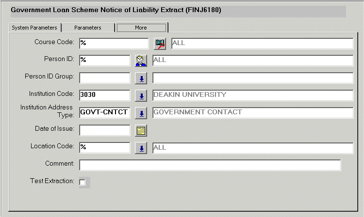 optional - the code of a single fee category can be selected or entered. Particularly useful for institutions which use different fee categories for different cohorts of students. Where an institution has a number of non Government Loan Scheme liable fee categories, processing can be reduced by running this job for only those categories which do have a Government Loan Scheme fee type. The default (%) is all fee categories. |
