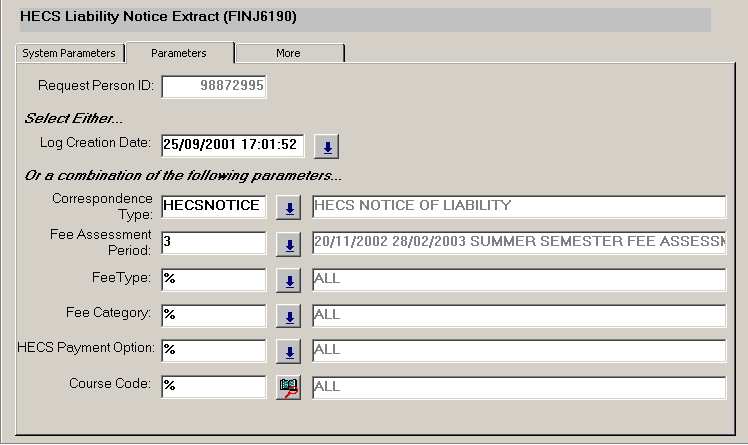 optional - the code of a single fee type can be selected or entered. Institutions using only one 'HECS' fee type can either select that fee type or leave as the default value (%). Institutions which have more than one fee type mapped to the system fee type HECS may select a single fee type from the LOV or use the default. The default is all fee types. |