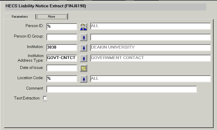 optional - a single person ID can be entered. This is typically used where a HECS notice is being produced for a single student, either as a replacement or because the student's HECS assessment has changed. |