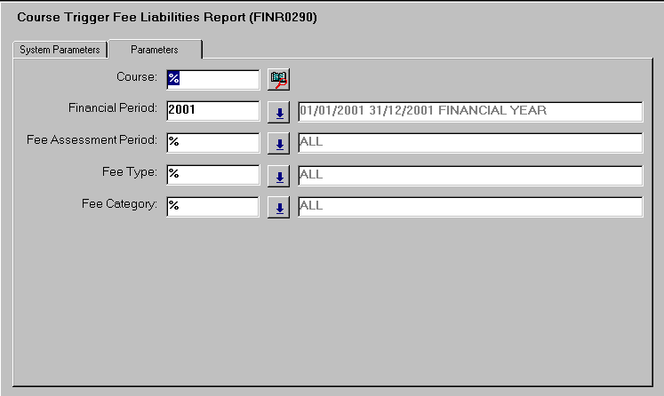 or valid for the financial period. Note that it is not possible, at parameter selection time, for the system to validate the fee type against a financial period, or validate a course code against either a fee period or a financial period. In these situations, an invalid combination results in a blank report. |