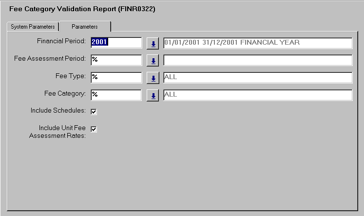 For information about system (or control) parameters, see All About Standard Reports. Report parametersA financial period must be supplied. Select this from the list of values or accept the default of the current financial calendar instance. Select or enter a fee assessment period, fee category and/or fee type, or alternatively accept the default of all values (%) for these three parameters. If a fee period is selected, it is validated as being subordinate to the selected financial period. A fee category and fee type, if selected, are checked as available within a selected fee period. The Include Schedules? parameter defaults to 'Yes'. If this default is accepted, the details of any schedules will be reported. Select 'No' if schedule details are not required. The Include Unit Fee Assessment Rates? parameter defaults to 'Yes'. If this default is accepted, unit fee assessment rates will be reported. Select 'No' if unit fee details are not required. |