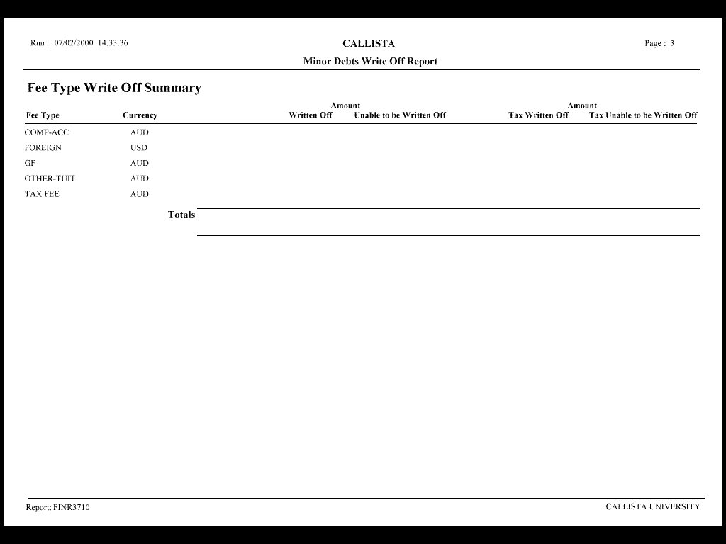 Run this report immediately after running FINJ3700 to check the results of that process, which writes off debts for selected students and fees. Note that there may be inconsistencies in this report if the Process Person Payment Schedules job (FINJ6111) has not been run after the most recent fee assessments for relevant students. The required sequence is: fee assessment, FINJ6111, FINJ3700, this report. |