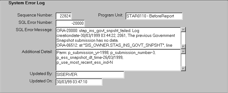 ![]() This form is used to view details of system errors. Most users will not have access to this form. They should record the details displayed in pop-up alerts and pass these on to their technical support people. A 'technical' person should then use this form to obtain details of the system error. Details of how the information displayed in this form should be used are contained in the Technical Documentation which accompanies Callista, under Support Procedure - Error Reporting Procedure. |