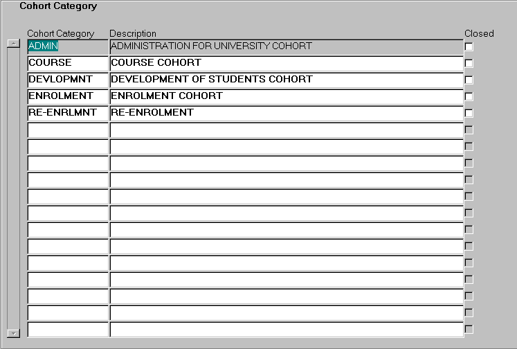 This form is used to define groups of cohorts. There is the potential for cohorts to be used widely in Callista. In the future, they may be used to run reports for specific groups of students more easily defined through cohort rules than through the available report parameters. As the cohorts functionality is enhanced, the number of available cohorts may become quite large. By grouping cohorts by categories created in this form, cohort categories may be used to narrow the list of cohorts viewed. Define a cohort category and meaningful description. A cohort category can be mapped against a cohort in the Maintain Cohort Category Mappings form (GENF1020). |