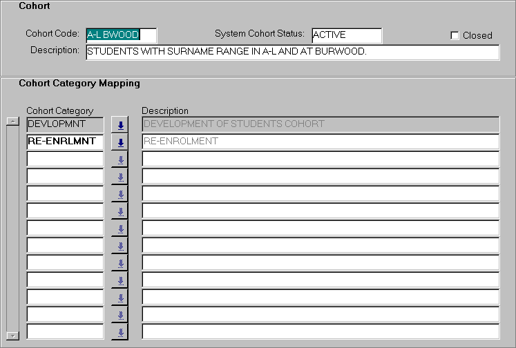 This form is used to map cohort categories to cohorts. Normally, this form is accessed in context via the Cohort Category Mapping button in the Maintain Cohorts form (GENF1000). It may also be accessed via a menu allowing cohorts to be queried. Optionally apply a cohort category from the LOV to a cohort. Cohort categories are defined in the Maintain Cohort Category form (GENF1010). |