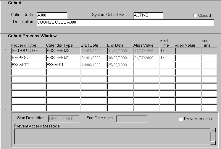 This form displays all cohort process windows for the context cohort. Normally this form is accessed in context via the Maintain Cohorts form (GENF1000) and the Maintain Cohort Process Windows form (GENF1100). It can be accessed via a menu allowing queries on the cohort to be performed. |