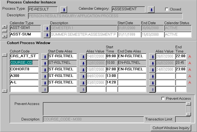 the variation period. This is future functionality. By selecting the Cohort Windows Inquiry navigation button, GENF1050 (Cohort Process Window Inquiry) can be accessed. This form displays all process windows that have been created for the context cohort code. |