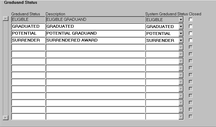 To create and maintain institution defined graduand statuses which are matched to system graduand statuses |