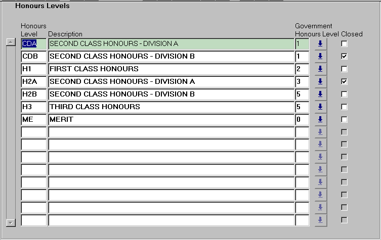 In the Graduation subsystem, these codes are recorded against graduand records in the form GRDF4200 (Maintain Graduand Details). In the Admissions subsystem, they are recorded against an applicant's prior tertiary education record in the form ADMF32B0 (Record Prior Tertiary Education). RankingEach honours level recorded in this form must be given a rank, for the following reason:– The job GRDJ5200 allocates sequence numbers to graduands. These numbers determine the order in which graduands will be presented with their awards at the graduation ceremony. There is the option in this job to group honours graduands separately. Where this option is taken, the job sequences honours graduates within the group according to the ranks assigned in this form. For example, graduands receiving first class honours may be ranked before those with second class honours, and they in turn will come before those with third class honours. |