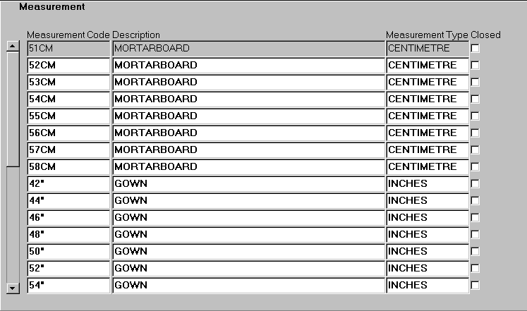Use this form to record the full range of hat and gown sizes available for supply to graduands. All details entered here appear in a list of values (LOV) in form GRDF4210 (Maintain Graduand Ceremony Details) where hat and gown size for a graduand are recorded. |