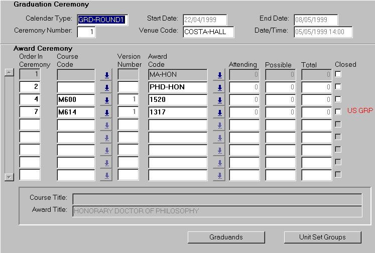 Once a ceremony round with its associated ceremonies is established in GRDF2100, use this form to record which awards are to be presented at each ceremony within the round. Only awards so recorded will be included in the round. A number (Order in Ceremony) assigned to each award record dictates its order of presentation in the ceremony. The majority of awards relate directly to courses (or strictly speaking, to course versions) but honorary degrees must also be recorded here. Awards are maintained in CRSF1190. Grouping graduandsDifferent ways of ordering in this form enable graduands to be grouped