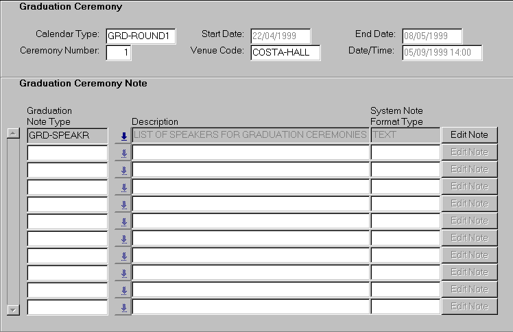 For the ceremony shown as context in the Graduation Ceremony block, notes of many types may be created. Each type reflects the common purpose of the notes associated with it. The available graduation ceremony note types are created in the form Maintain Graduation Note Types (GRDF1510). Notes may be created, stored and retrieved in almost any format. The currently available formats are: