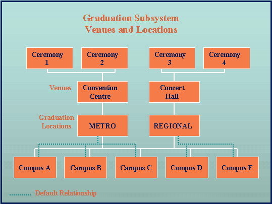 GRDJ5100, is designed to place each graduand at a ceremony whose venue is associated with the main campus at which they have been studying. In order to achieve this, a structure of linked venues, graduation locations and campus locations must be in place.Each graduation ceremony is held at a specified venue. Each venue is associated with a single nominal 'graduation location'. A campus location can be associated with one or more graduation locations, but one graduation location must be nominated as the default for the campus. The example in the diagram below illustrates a possible structure.