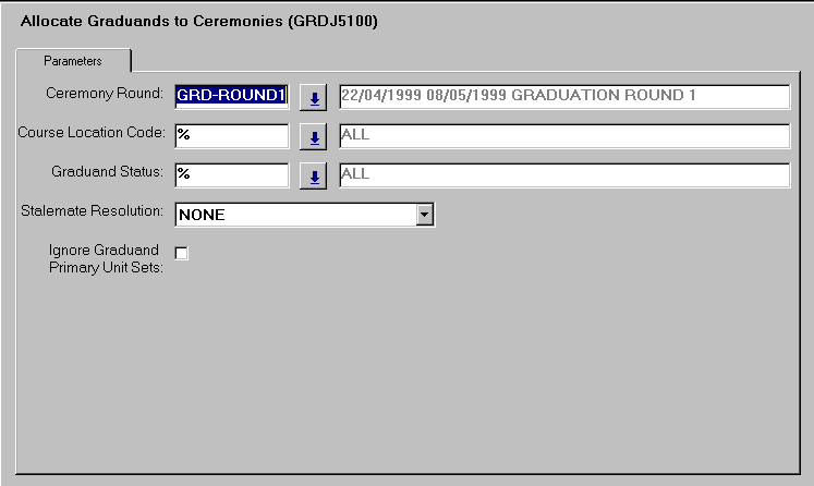 This job accesses graduand records created by running GRDJ3100 (Identify and Create Graduands) or by entering individual graduands in the form GRDF4200 (Maintain Graduand Details). Potential graduands for allocationGraduands may be allocated to ceremonies by this process if
