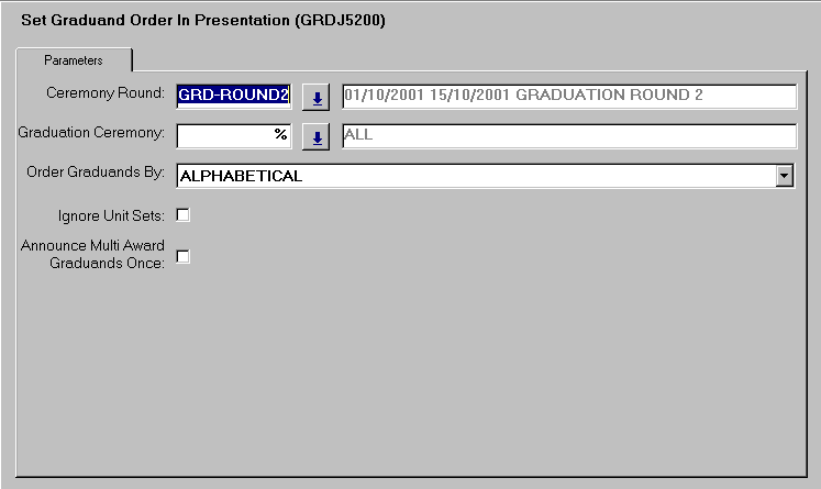 MethodGRDJ5200 runs only in batch mode, through the Job Control & Scheduling subsystem.Place in processingThe job GRDJ5100, allocating graduands to ceremonies, must be run before this one. After running this job, the graduand's Order in Presentation number appears in forms GRDF4210 and GRDF3200. To re-order graduandsThis job can be re-run as many times as needed to re-order graduands in a ceremony. Reasons to re-run include: