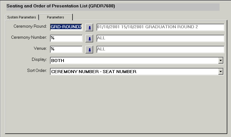 This report can be run on-line or in batch mode in job scheduler. Preparation for this report involves performing a number of activities within the Graduations subsystem. Initial ordering of groups of graduands is performed at award level and optionally at unit set group level, in GRDF2110 and GRDF2120 respectively. Once the graduands in a particular ceremony are identified, each attending graduand is allotted an order number within a ceremony by running GRDJ5200. Seat numbers are allocated manually in GRDF4210.This report produces a list based on the allotted order or seat numbers for a particular ceremony round, ceremony or venue, depending on the parameters selected. |