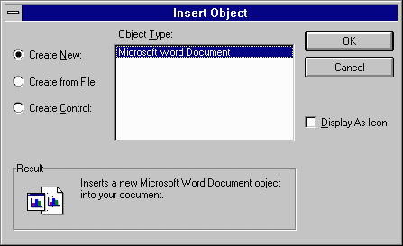 - From the menu, select Insert Object. A dialogue box is displayed. In the dialogue box, there are radio buttons providing three options: