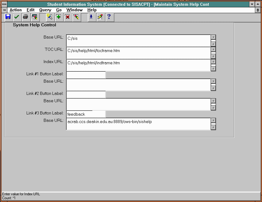 | The location of this page of the user manual when mounted on a user's desktop computer might be: c:/ausis/help/html/hlpf0010.htm. All the files comprising the user manual reside in the sub-directory help/ ,therefore c:/ausis/ will be common to all the files and can be defined as the base URL. If the files comprising the user manual were to be transferred onto a fileserver at Deakin University, the directory help/ and its entire contents could be moved to a directory on the file server such as servername.its.deakin.edu.au/directory1/ /directoryn/ . This path could then be specified as the base URL and this page would have a URL of servername.its.deakin.edu.au/directory1/ /directoryn/help/html/hlpf0010.htm . Changing the base URL will have made all of the files of the user manual accessible from the System's Help form. |