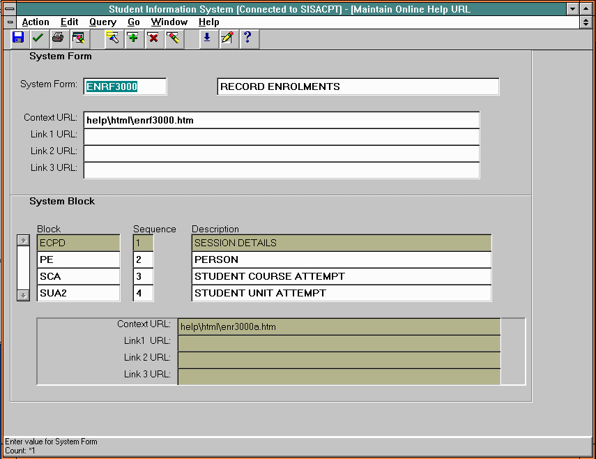 | This form (HLPF0020) consists of two blocks (System Form and System Block). In this case, it is sufficient when using the form in the System, to have one set of explanatory documentation to describe the use of both the form and the individual blocks. In some forms (such as the Record Enrolments form (ENRF3000) which is displayed over many blocks and many screens), explanation is sufficiently involved to make the use of a separate "page" for each block a more efficient way to present user information. Use this form (HLPF0020) to query the URL details for System Form ENRF3000. The name of each block in ENRF3000 will be displayed. Select each block in turn to view the context URL for the block. Note that block URLs will override the displayed form URL. |